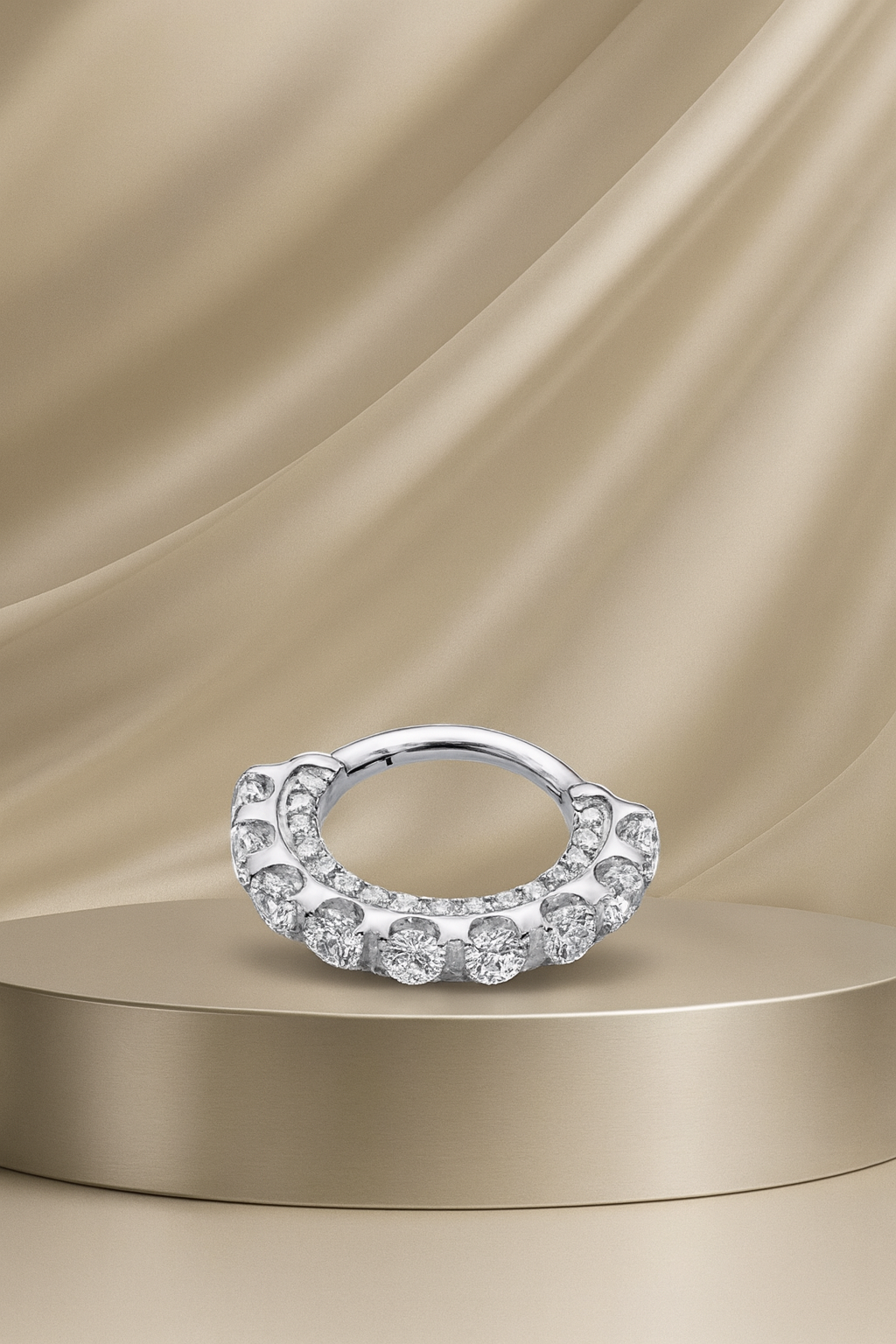 Aro con bisagra en titanio grado implante ASTM F-136, acabado zirconias para un brillo elegante. Ideal para septum o daith. Medidas: 16g · 8 mm. Cierre tipo clicker.