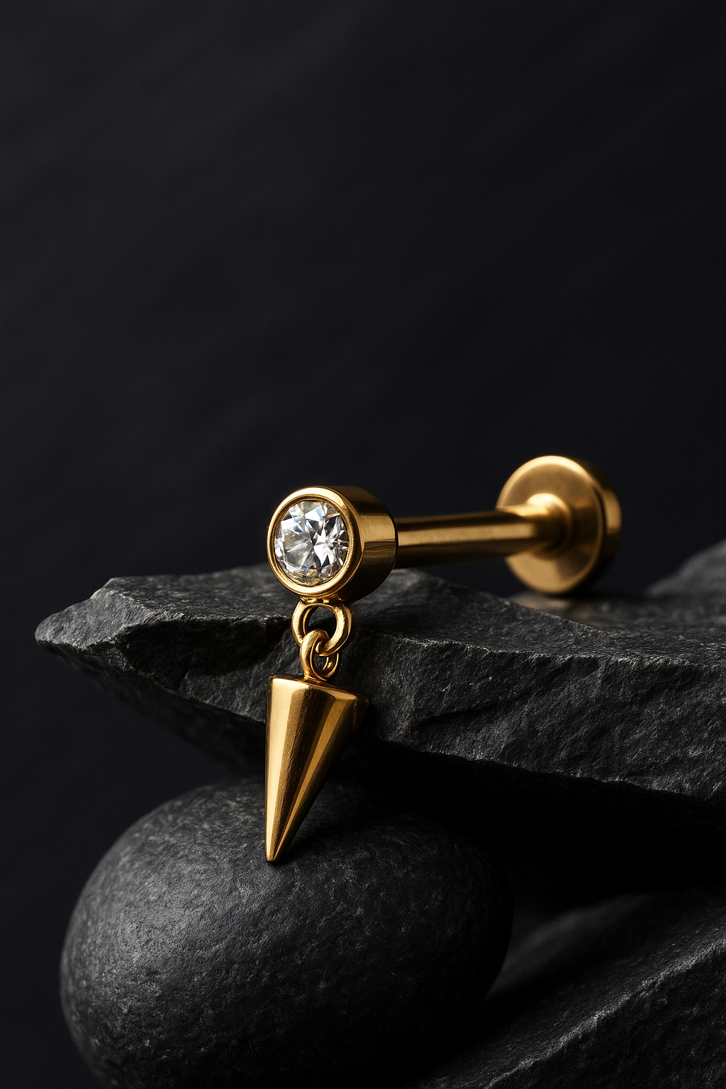 Pieza de titanio grado implante, color dorado con circonia, 16 gauge con base labret. Cuenta con una pieza colgante y rosca interna. Totalmente hipoalergénica.