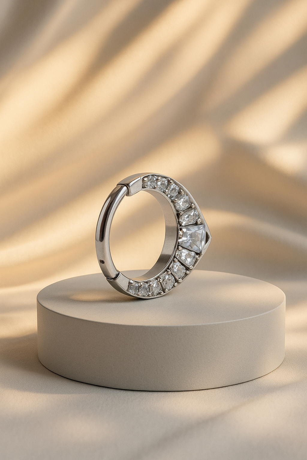 Argolla de titanio grado implante G23, hipoalergénica y en color plateado. Diseño con circonias brillantes y cierre tipo clicker para un ajuste cómodo. Tamaño 8 mm (16g), ideal para septum o daith.
